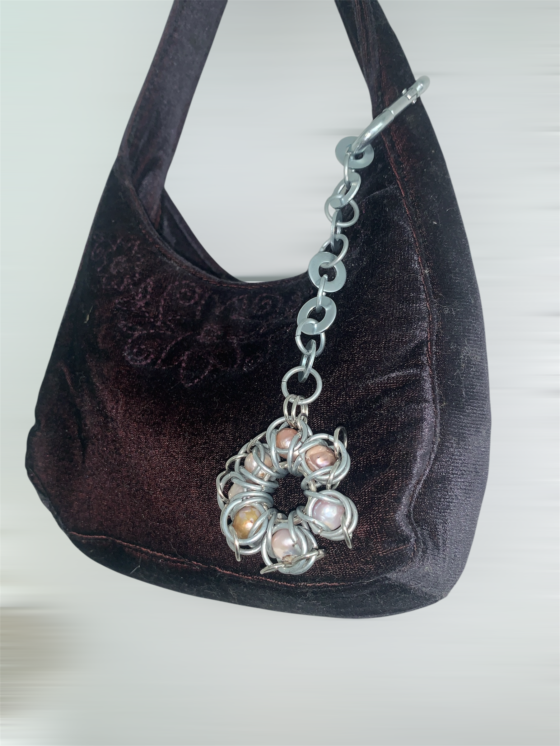 Fabriqué artisanalement, ce pendentif en forme de fleur revisite les techniques de la cotte de maille, apportant robustesse de l’acier carbone à la finesse des perles nacrées et d’un design travaillé minutieusement.